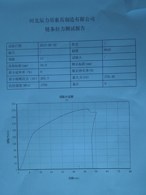 的13mm、16mm兩種規格的拉力檢測報告。為您展示辰力公司在起重鏈條生產制造方面的能力,歡迎廣大客戶蒞臨我公司參觀指導。聯系電話: 0312-8037111(辦公室)