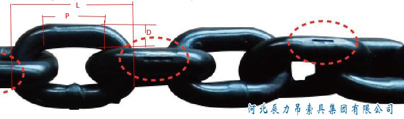 4.鏈條必須有光滑和清潔的表面,如發現有裂紋,砸扁、塑性變形,鏈環伸長達原長度的5%或鏈環直徑磨損達到原直徑達到10%以及嚴重彎曲等現象禁止使用。