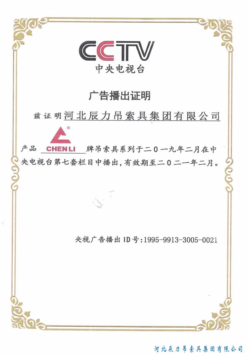 辰力牌吊索具系列于2019年2月在***電視臺第七套欄目播出,有效期2021年2月。